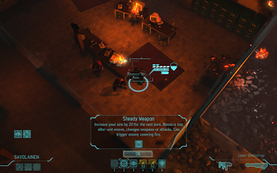Next turn, the squad breaks into teams. Trips' team - including Frost and Tat - take the upper level while Vixen's team - Rascal, Gupta, Luthuli, and Savolainen - take the ground floor. Savolainen steadies another rocket.
